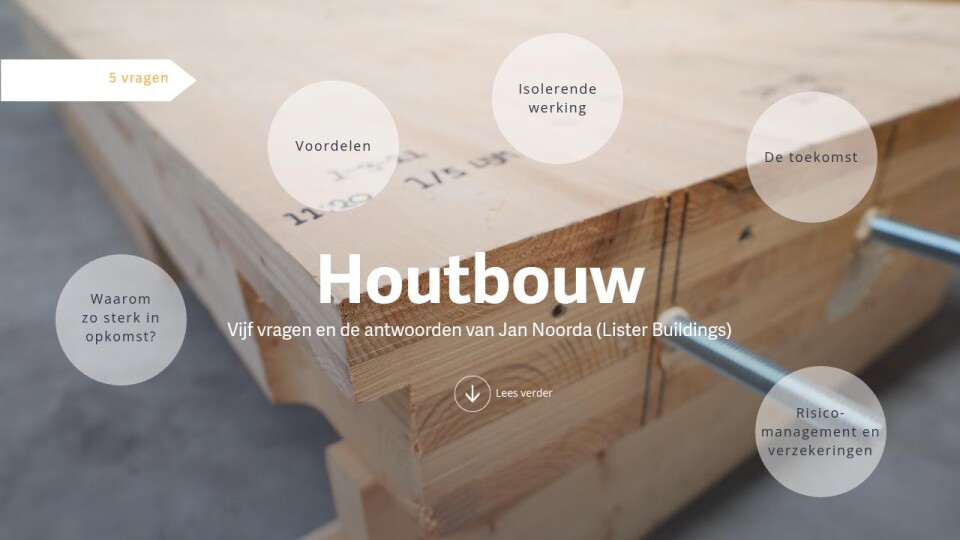 Houtbouw zit in de lift. Het heeft veel voordelen ten opzichte van traditionele bouw met staal en beton. Ook roept houtbouw vragen op, onder meer in het kader van risicomanagement en verzekeren. Wij stellen er vijf aan Jan Noorda. Hij leidt het Development team bij Lister Buildings, een innovatieve koploper in de vastgoedmarkt. Het bedrijf werkt onder meer met een zelf ontwikkeld modulair en circulair bouwsysteem dat bestaat uit hoogwaardige houten elementen.