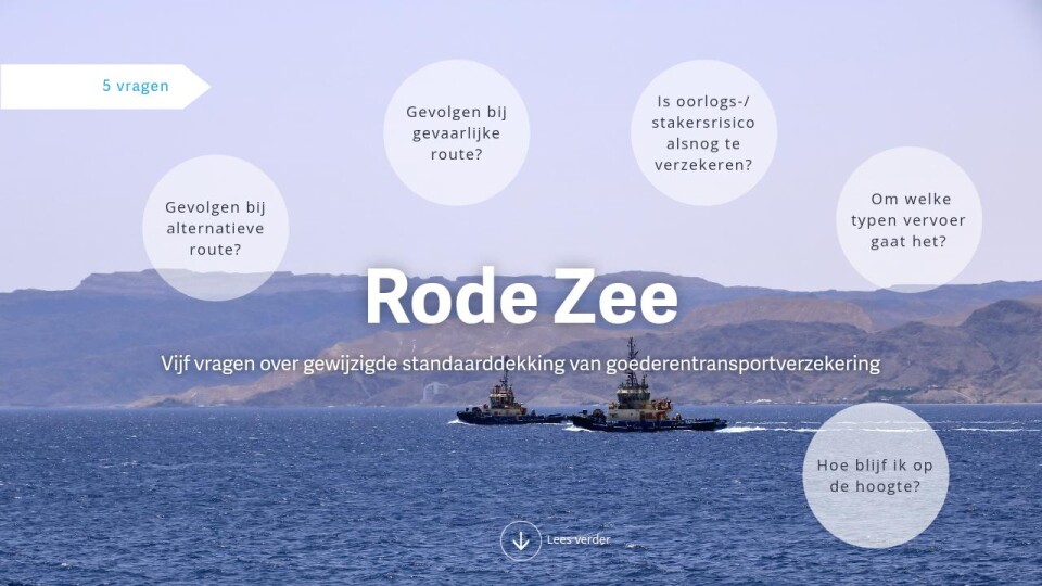 ‘De meeste rederijen mijden de Rode Zee, de Golf van Aden en de Indische Oceaan. Zij kiezen ervoor om te varen via een alternatieve route. De nadelen hiervan zijn uiteraard een langere transportduur, vertraging in levertijden en hogere kosten. Maar de standaard dekkingen van transportverzekeringen blijven op veilige routes ongewijzigd.’