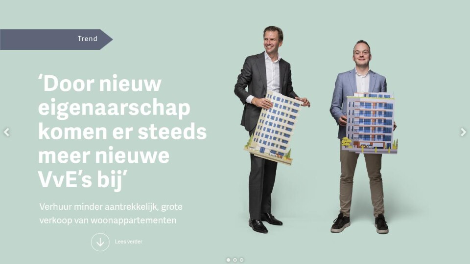 Vastgoedbeleggers en -grooteigenaren besluiten tegenwoordig vaker verhuurappartementen in wooncomplexen af te stoten. Bij die zogenaamde uitponding verandert het eigenaarschap en dus de juridische entiteit; de oprichting van een VvE is dan wettelijk verplicht. Wat is de oorzaak van deze trend? Een gesprek daarover met Jelmer van Popta, manager VvE en partner bij Meijers en Nick de Kort accountmanager van Meijers. Over het belang van regie en grip houden bij de start van een nieuwe VvE. En over de onderscheidende dienstverlening van Meijers voor VvE-beheerkantoren op het gebied van verzekeringen en schadeherstel voor VvE’s.