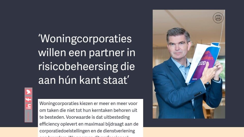 ‘De totaaldienstverlening die wij woningcorporaties bieden leidt tot optimale risicobeheersing, maximale preventie en efficiency en dus lagere kosten’, besluit Stoffels. ‘Daarbij voegen we kennis toe. Kennis over nieuwe risico’s die op corporaties afkomen en het voorkomen van de onverzekerbaarheid van bepaalde risico’s. Lessons learned bij andere corporaties. Nieuwe mogelijkheden, waaronder de collectieve aanbesteding van risicomanagement en verzekeringen. Het is een continu proces, waarbij we ook onze dienstverlening steeds weer scherpstellen op basis van de wensen van de klant.’